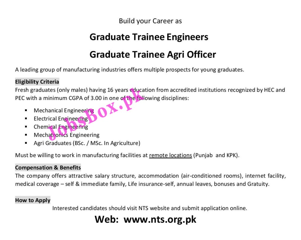 A leading group of manufacturing industries offers multiple prospects for young graduates. We get this advertisement of Graduate Trainee Engineers and Graduate Trainee Agri Officers Jobs 2021 via NTS from the National Testing Services NTS website www.nts.org.pk. Interested individuals can visit the NTS website for more information.
