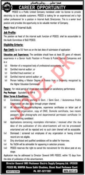 Peshawar Electric Supply Company PESCO Peshawar, Government of Pakistan is seeking for the services from experienced and committed candidates for the posts of Head of Internal Audit.