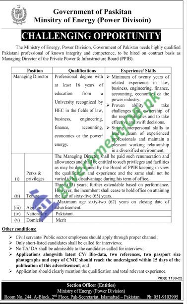Vacant positions, including managing director, have been declared in the Ministry of Energy Islamabad, Islamabad Pakistan, according to a 27 August 2022 advertisement in the daily Jang Newspaper.