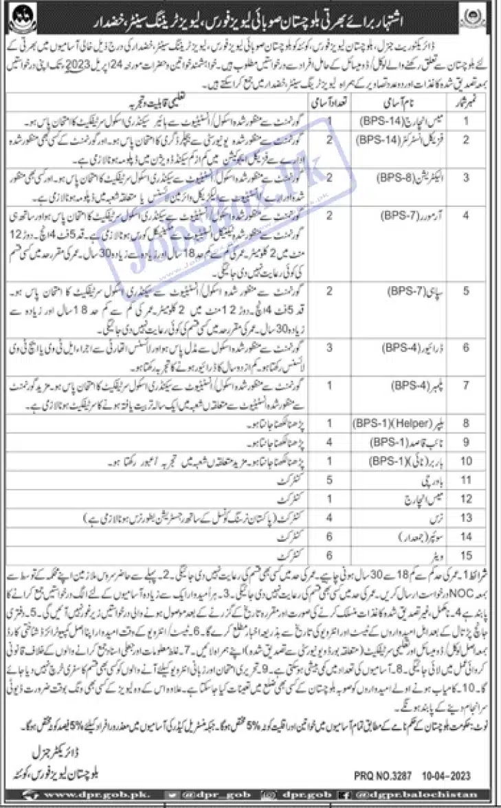 The Directorate General Balochistan Levies Force has announced this notification through the Daily Jang newspaper published on April 16 , 2023. Only residents of Balochistan Province are eligible for this recruitment. These career opportunities are offered to Males and Females, including quotas for Minorities and Disabled Persons. Literate to Bachelor’s Degrees holders are eligible for this appointment. Today, Levies Force Balochistan has announced two advertisements for the appointment from (BPS-01) to (BPS-14). Candidates searching for Sipahi Jobs, Matric Base Jobs, or Forces Jobs must apply. Currently, Levies Force wants to hire applications to recruit Wireless Operators, Wireless Mechanics, Naik, Tracer, Sipahi (Soldiers), Drivers, Sweepers, Mess In-charge, Electricians, Plumbers, Naib Qasid, Barbers, Cook, Nurses, Sweepers, Waiters, and Water Carrier. District Quotas are also described for Chaghi, Loralai, Mosa Khel, Mastung, Pishin, Panjgur, Sibi, Kech, Washuk, Zhob, Bolan, Sohrab, Khuzdar, Awaran, Dukki, Kharan, Harnai, Jhal Magsi, Nushki, and Ziarat. Candidates who wish to apply should have the qualifications of Literate, Primary, Matriculation, Middle, Intermediate, and Bachelor’s Degrees. Typing Speed and other skills related to IT described in the advertisement must be followed by the applicants. Candidates applying for Sipahi Jobs/Soldier Jobs must meet physical demands such as Age, Height, Weight, and Physical Endurance Test requirements. Complete information is posted in the advertisements. The age limit for this appointment should be a minimum of 18 years and a maximum of 30 years. However, relaxation in the upper age limit will be granted per the Government Recruitment Policy. For Advertisement No. 1, applicants must forward their applications to the concerned Deputy Commissioner Offices. For Advertisement No. 2, interested individuals can forward their resumes to the Levies Training Center, Khuzdar. Government servants should provide NOC with the application. Applications with complete information must reach before 24th April 2023.